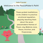 These digital guided meditations help children calm their bodies, hearts, and minds while learning about emotional regulation and the 7 PeaceMakers themes of Power, Joy, Balance, Love, Peace, Intuition, and Forgiveness.